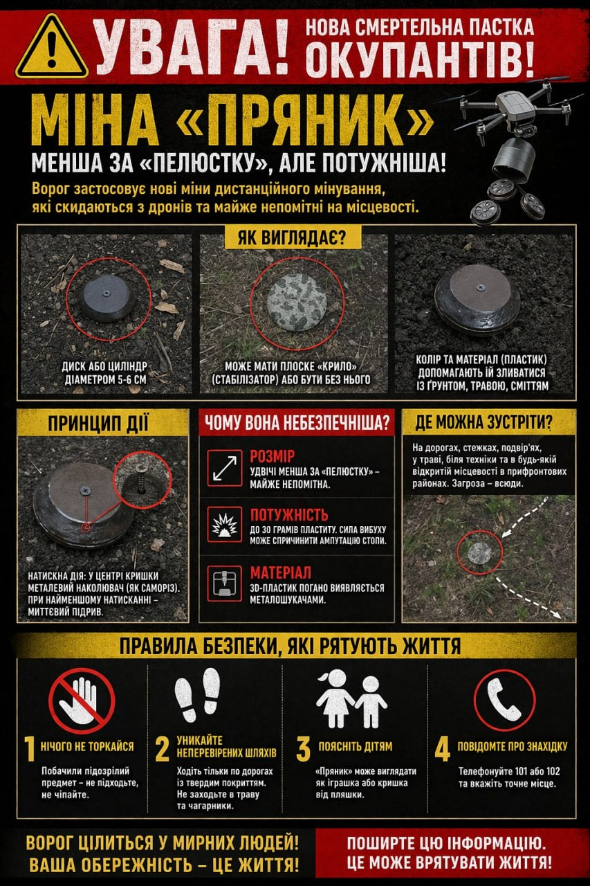 Російські окупанти почали розкидати в Нікопольському районі Дніпропетровської області малопомітні протипіхотні міни «Пряник». Ці вибухові пристрої становлять смертельну небезпеку для людей.