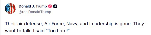 В коротком посте Трамп подчеркнул, что не видит смысла в переговорах. «Их ПВО, воздушных сил, флота и руководства больше нет. Они хотят говорить. Я сказал: "Слишком поздно!"», — написал он в своей соцсети, не уточняя деталей сигналов из Тегерана.